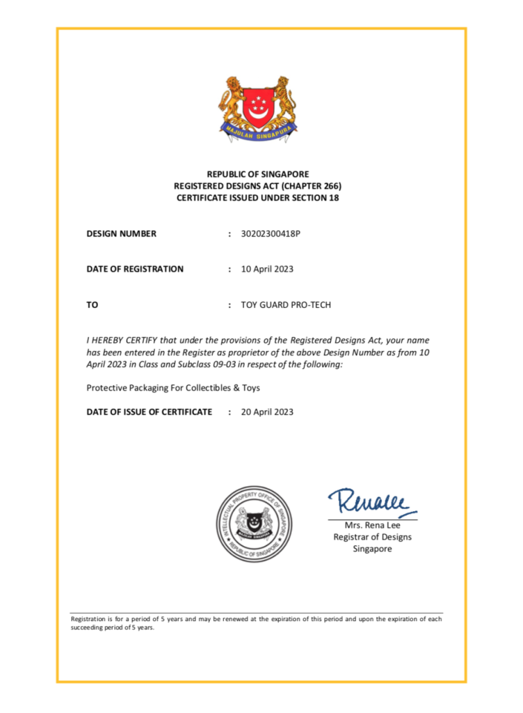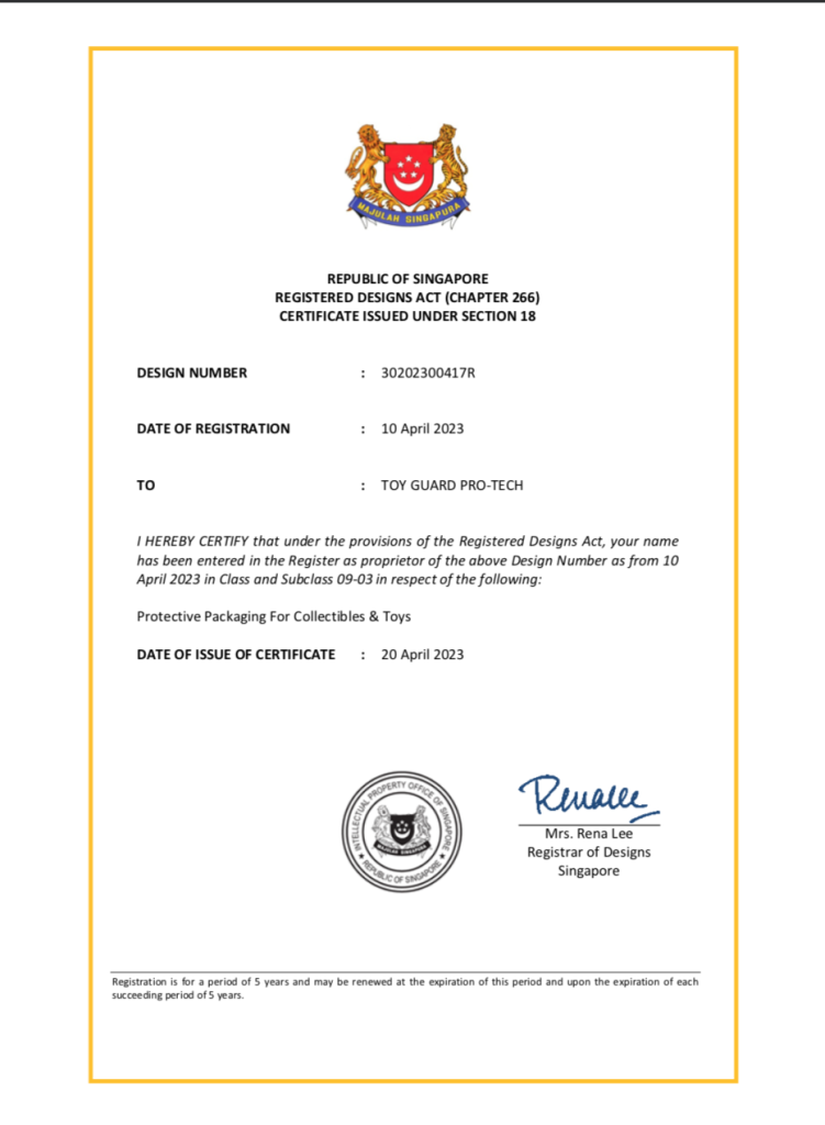 What this means is that All our Designs are Protected by the Singapore Authorities and Toy Guard® have the rights to prevent others from using the design without our Permission and to bar others from copying it.